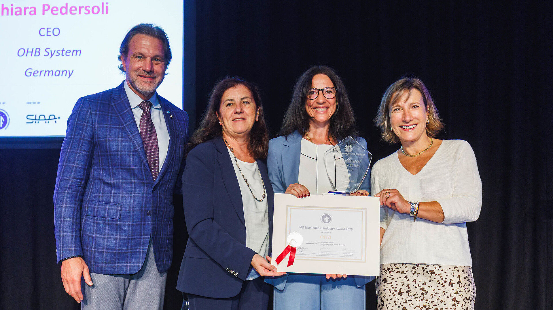 Sydney, 1. Oktober 2025. Ein bedeutender Moment für die OHB System AG auf dem IAC: Das Raumfahrtunterhemen wurde von der International Astronautical Federation (IAF) mit dem „Excellence in Industry“-Award in der Kategorie „Large Companies“ geehrt. Die IAF würdigt mit diesem Preis Unternehmen, die mit innovativen Weltraumtechnologien weltweit Maßstäbe setzen. Die Vorstandvorsitzende der OHB System AG, Chiara Pedersoli, nahm die Auszeichnung persönlich auf dem International Astronautical Congress (IAC) in Sydney entgegen und betonte in ihrer Dankesrede die zentrale Rolle der Mitarbeitenden: